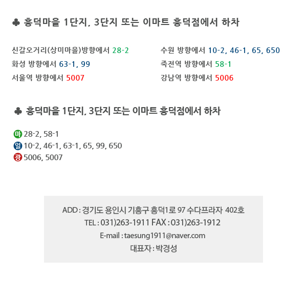 ADD : 경기도 용인시 기흥구 흥덕1로 97 수다프라자 402호 l TEL : 031)263-1911 l FAX : 031)263-1912
